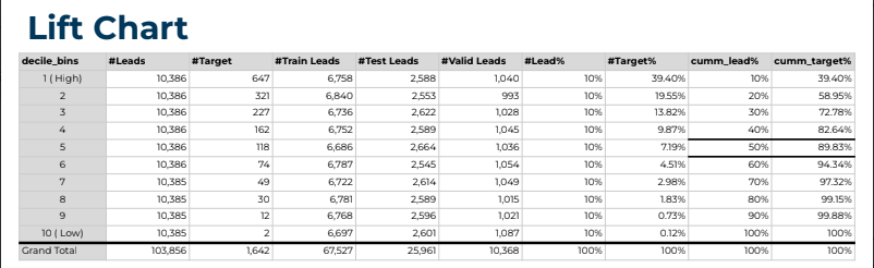We are able to convert 89% of the leads, by focusing on top 50% of prospect list